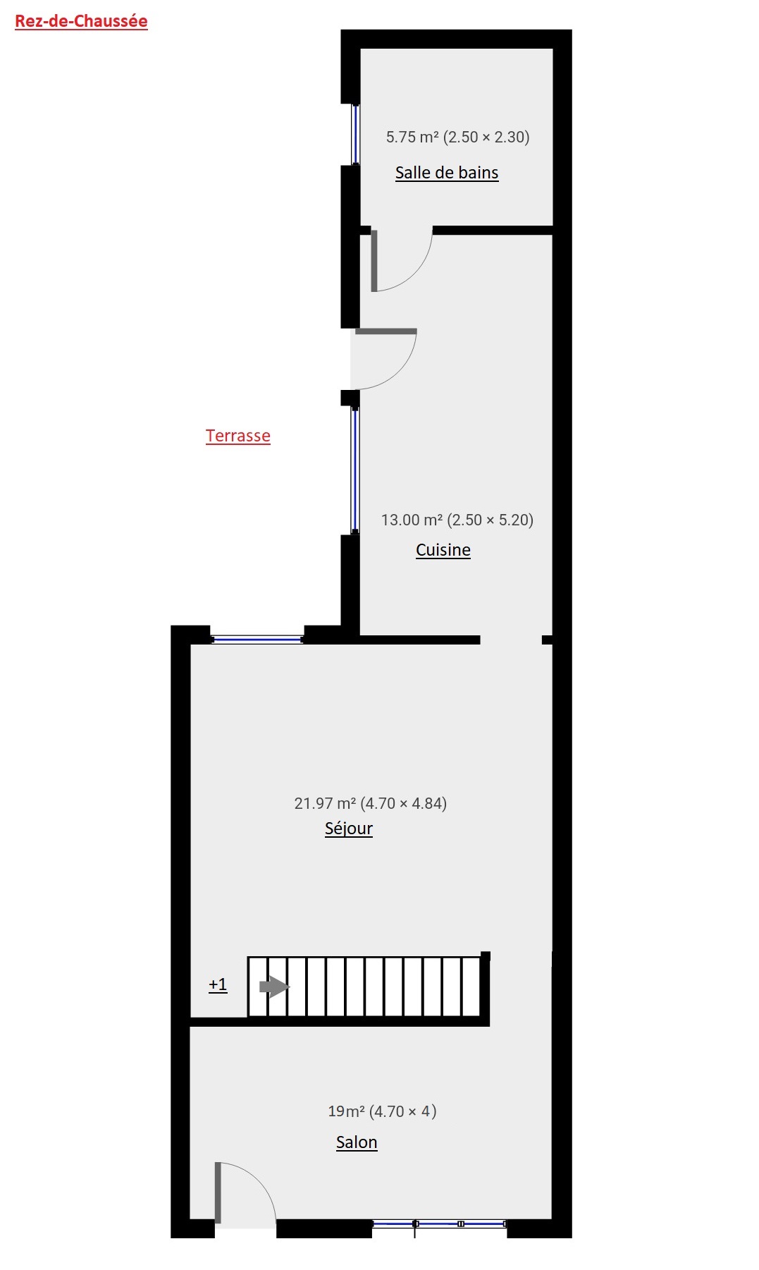 Au r-d-c: Salon (+-13 m²), séjour (+-22 m²), Cuisine équipée (+-13 m²), salle de bains (+-6 m²),-