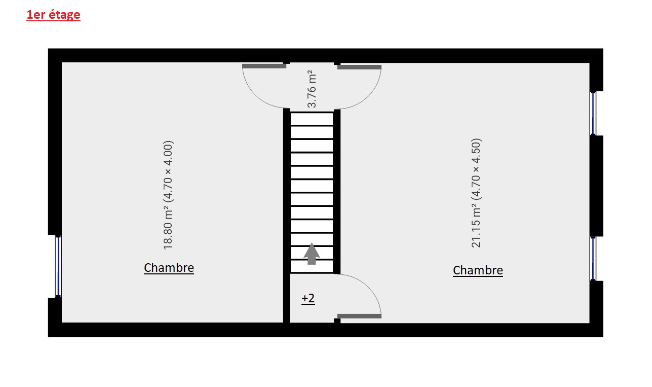 Etage 1: Hall de nuit (+-1 m²), Chambre 1 (+-19 m²), Chambre 2 (+-22 m²), Hall de grenier (+-1 m²)