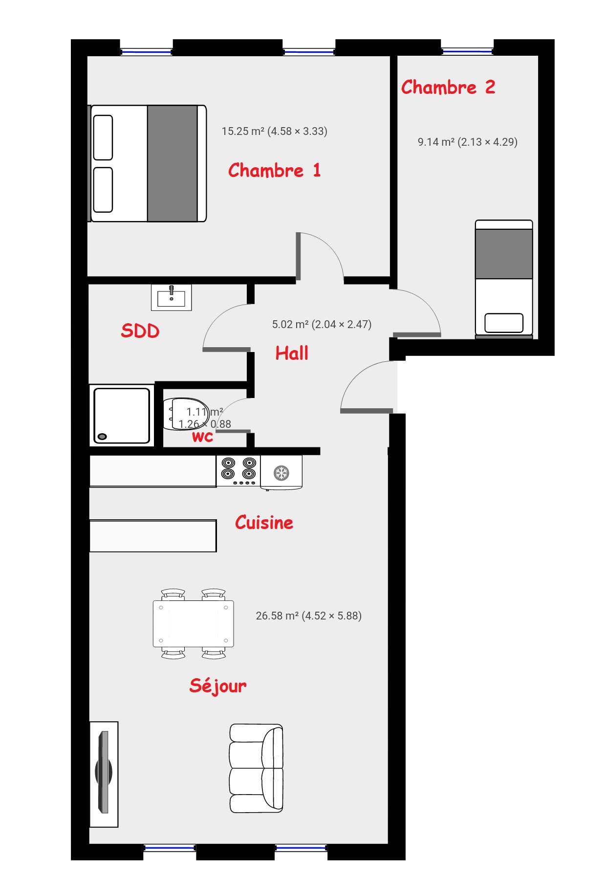 Rez-de-Chaussée : Hall d'entrée de +/- 5 m², Séjour - Cuisine de (+/-27 m²), WC séparé (+/-1 m²), Chambre 1 (+/-15 m²), Chambre 2 (+/- 10 m²), Salle de bains (+/- 4 m²)