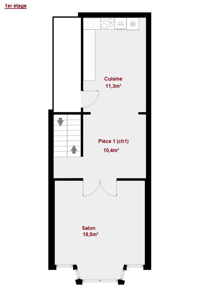 Etage 1: Hall (+-2m²), Séjour (+-19m²), cuisine/salle à manger (+-20m²).