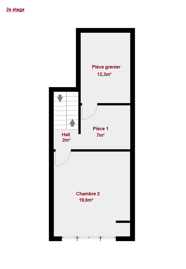 Etage 2: Hall de nuit (+-2m²), chambre 1 (+-20m²), pièce libre (+- 7m²), grenier/chambre 2 (+- 12m²).