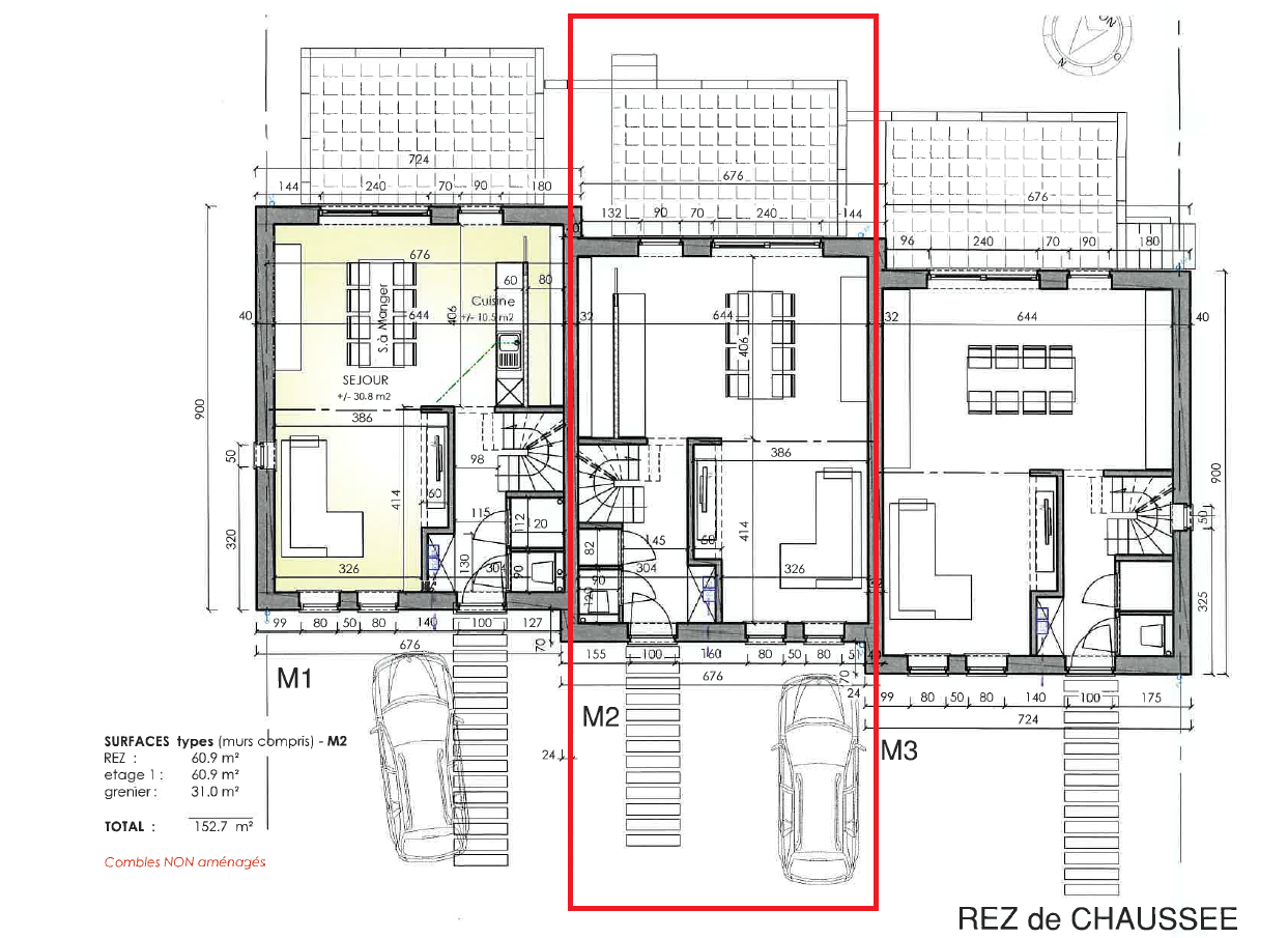 Rez-de-chaussée: Hall d'entrée, WC, débarras, séjour, cuisine équipée